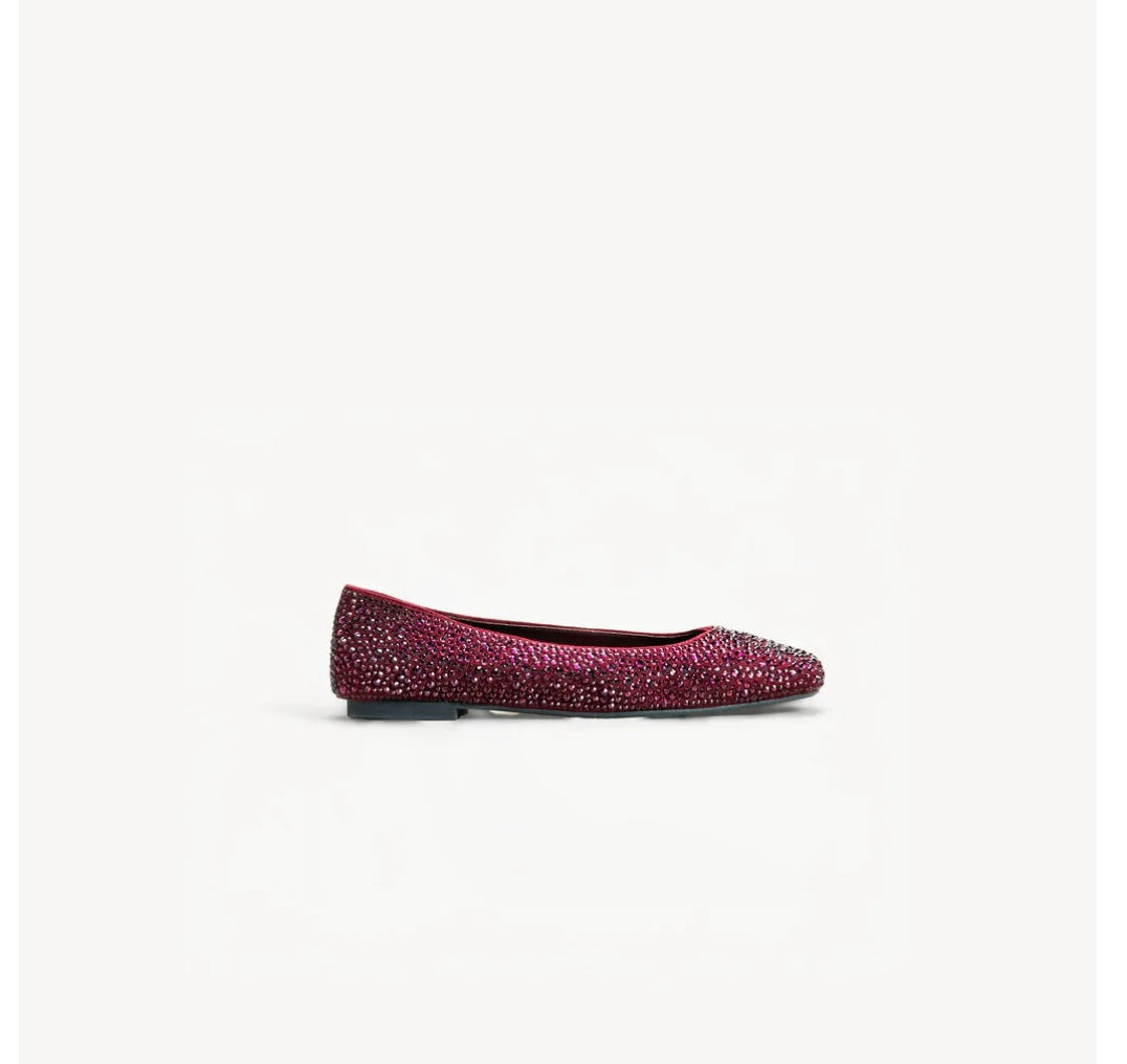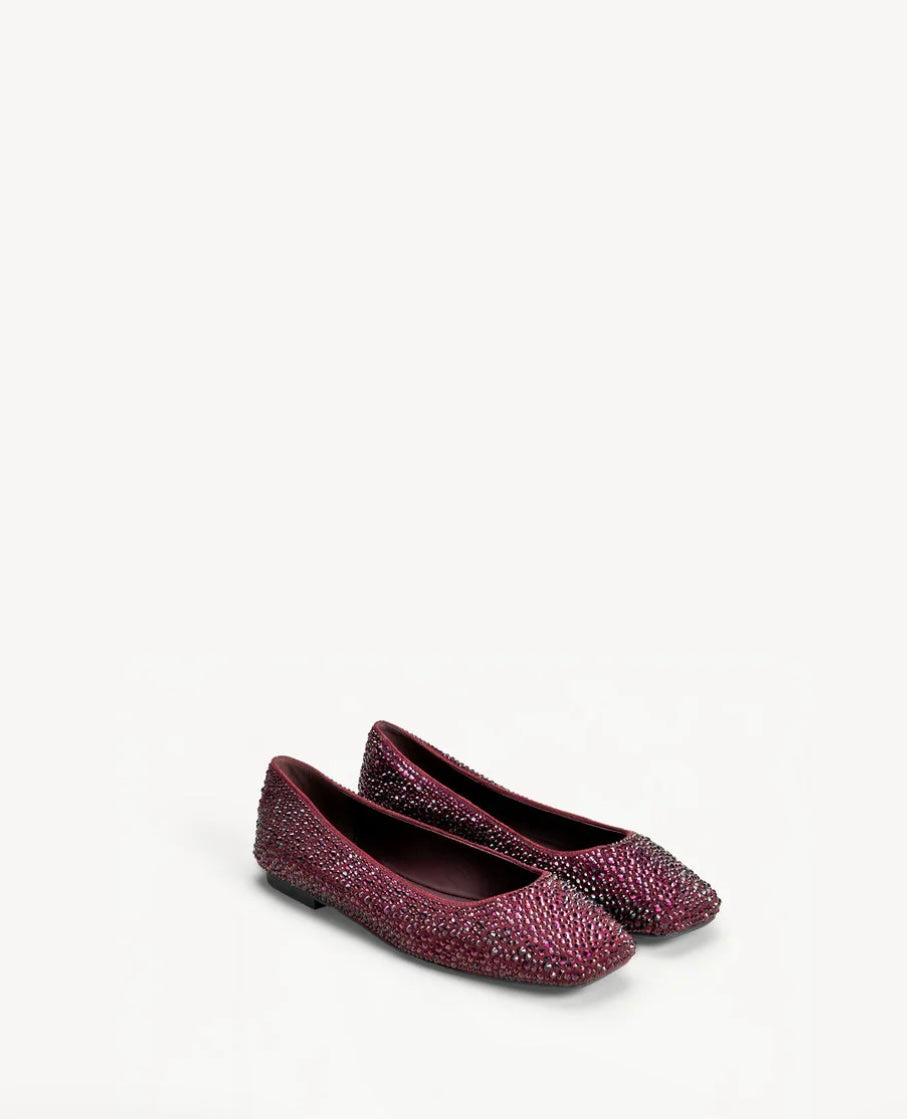 Ballerina color mosto con base in microfibra, cristalli a tono applicati e punta squadrata.