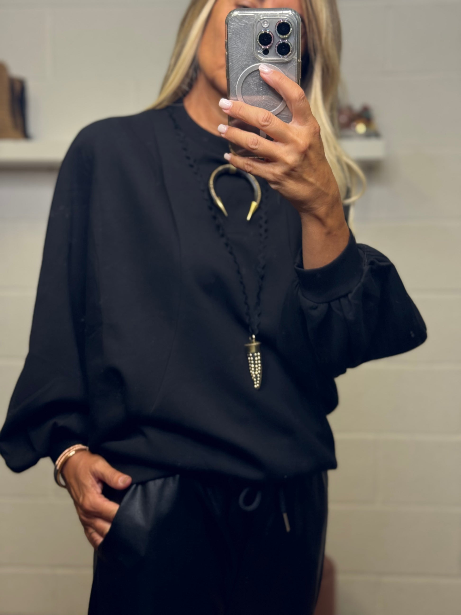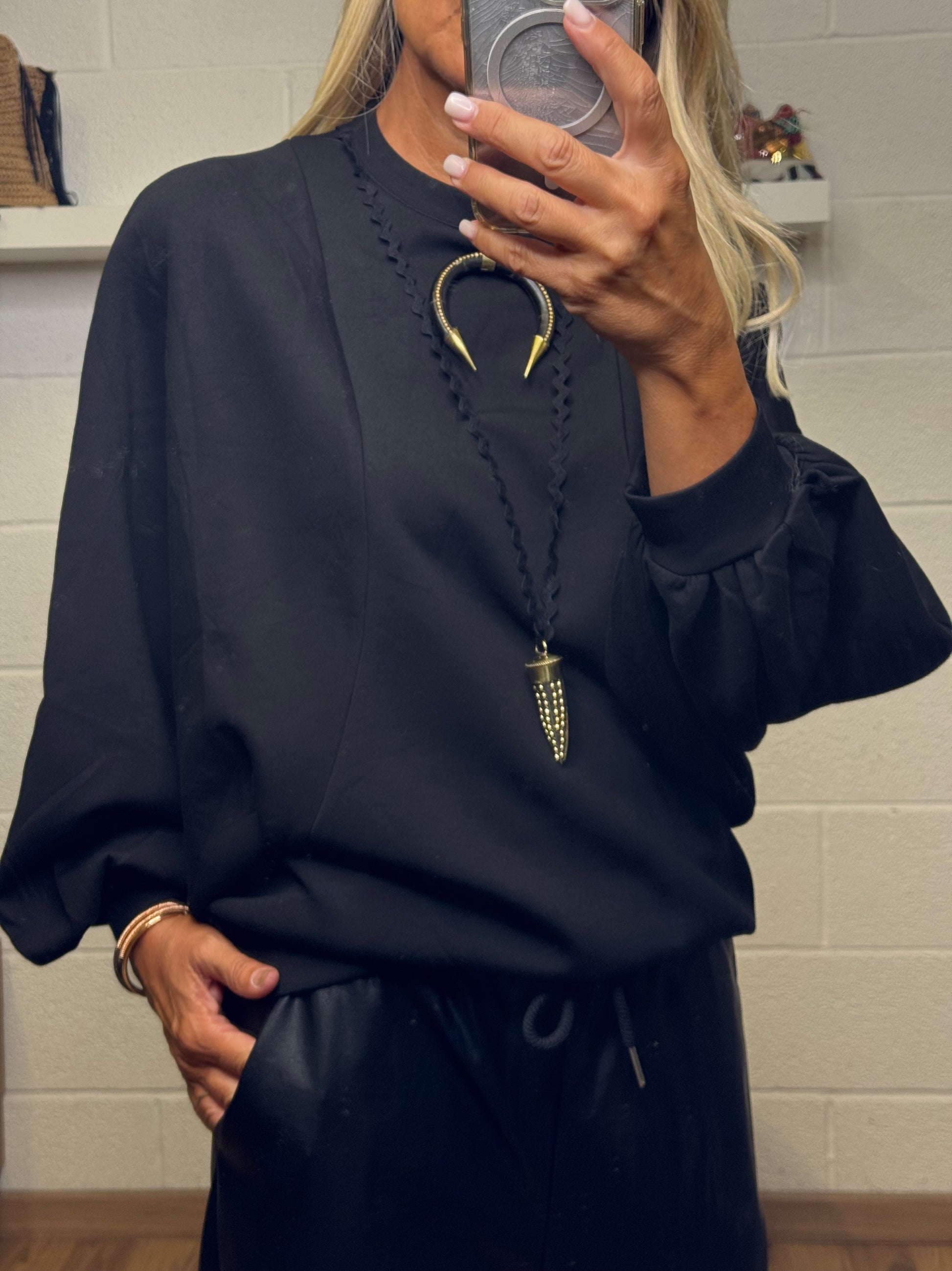 Questa felpa nera oversize è il capo ideale per chi cerca comodità senza rinunciare allo stile. Il design morbido e strutturato valorizza ogni silhouette, mentre il polsino arricciato dona un tocco femminile e ricercato.