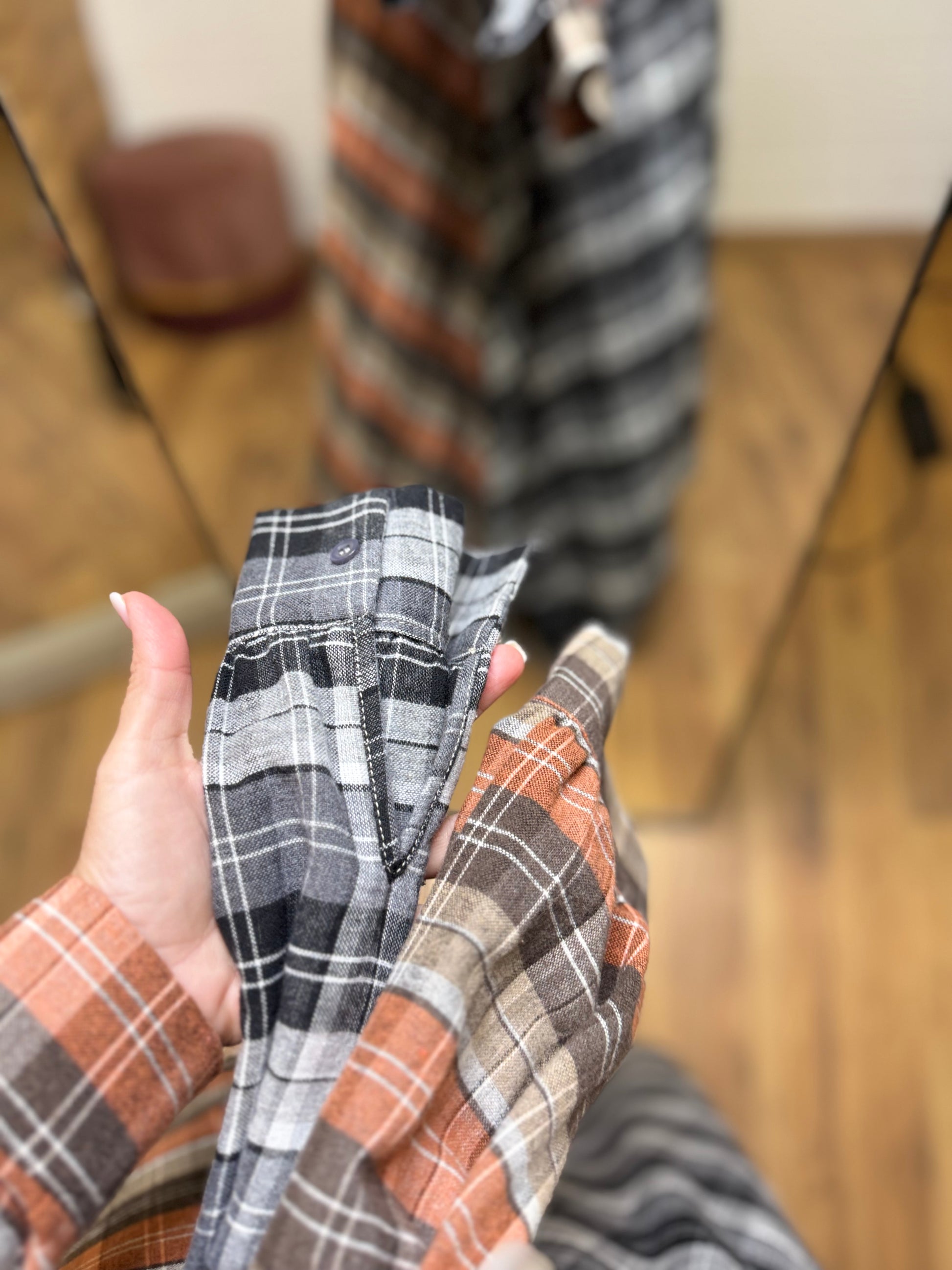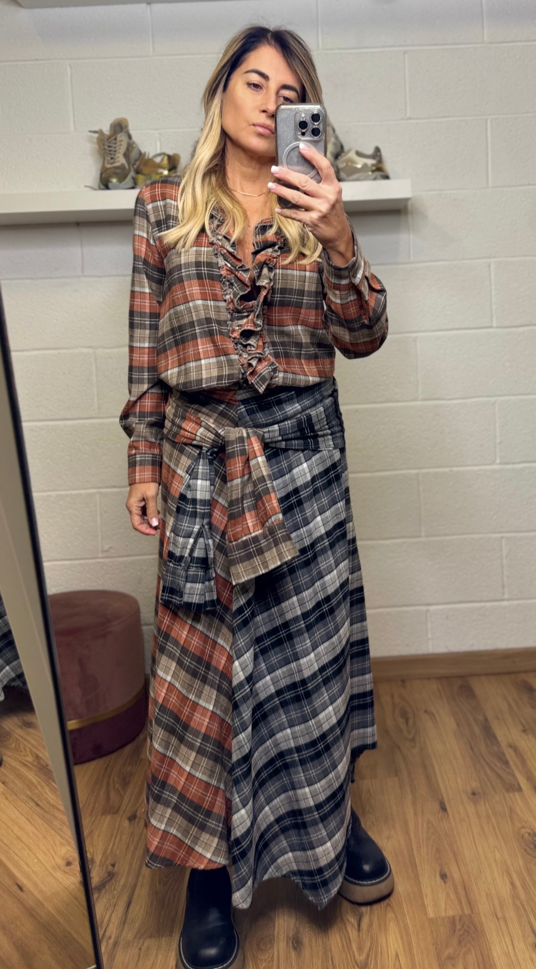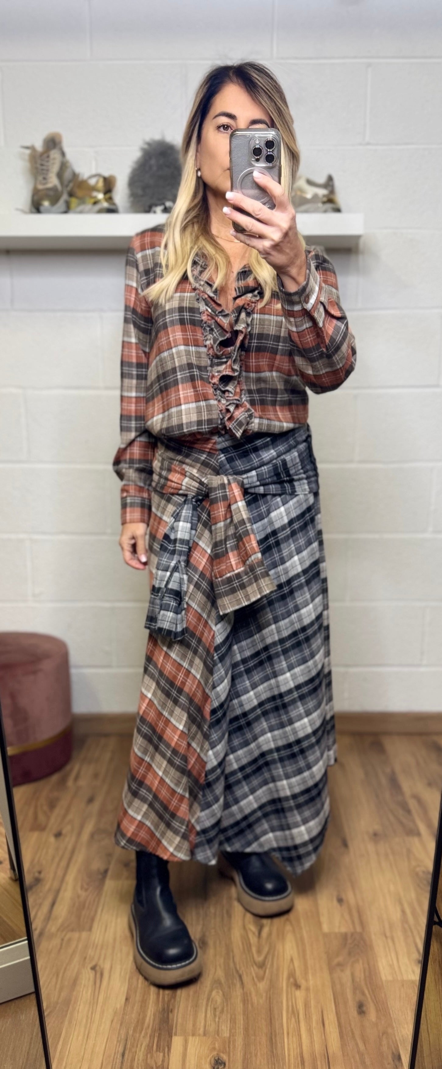 Gonna a ruota felpata in check grigio e nero, arancio e marrone