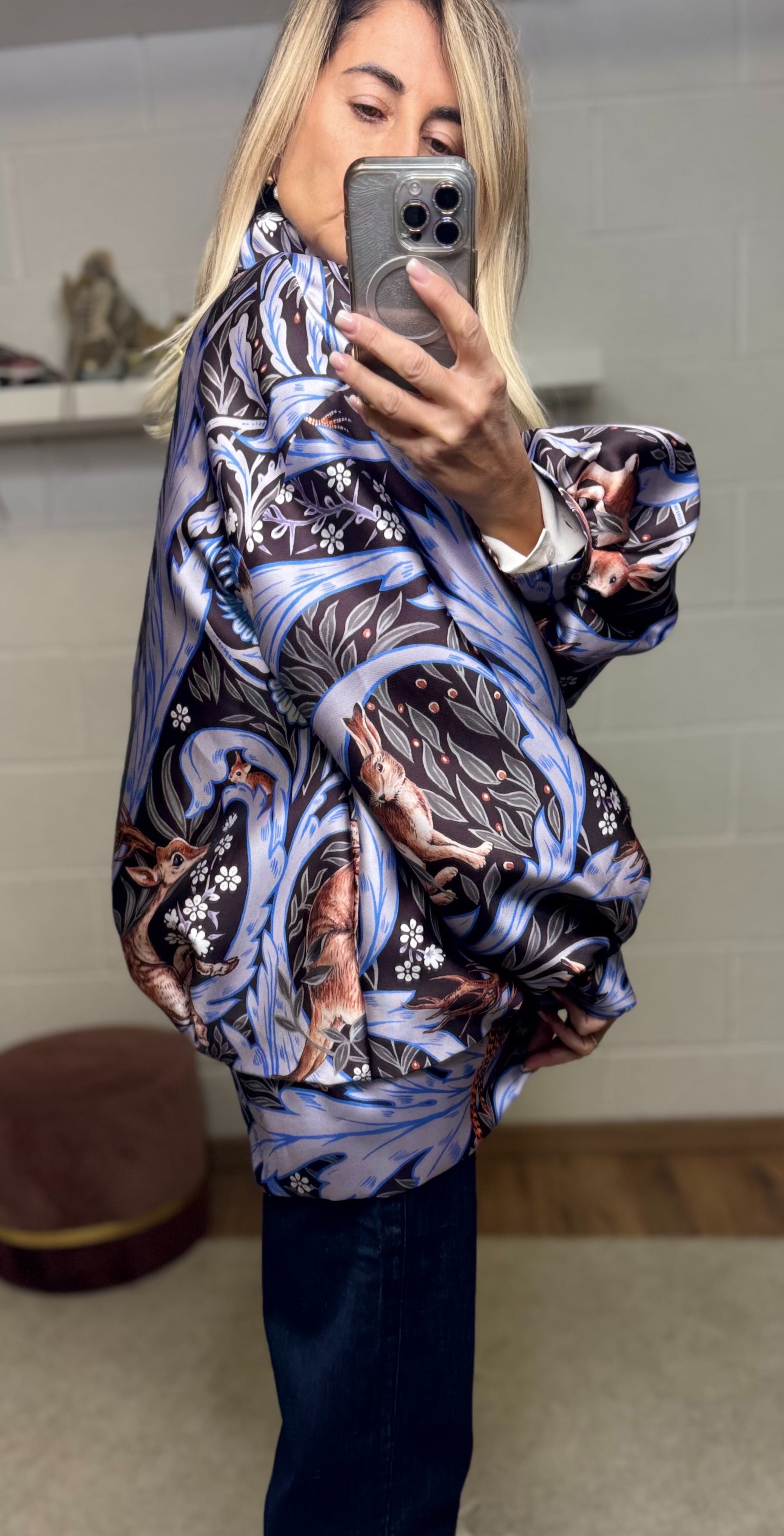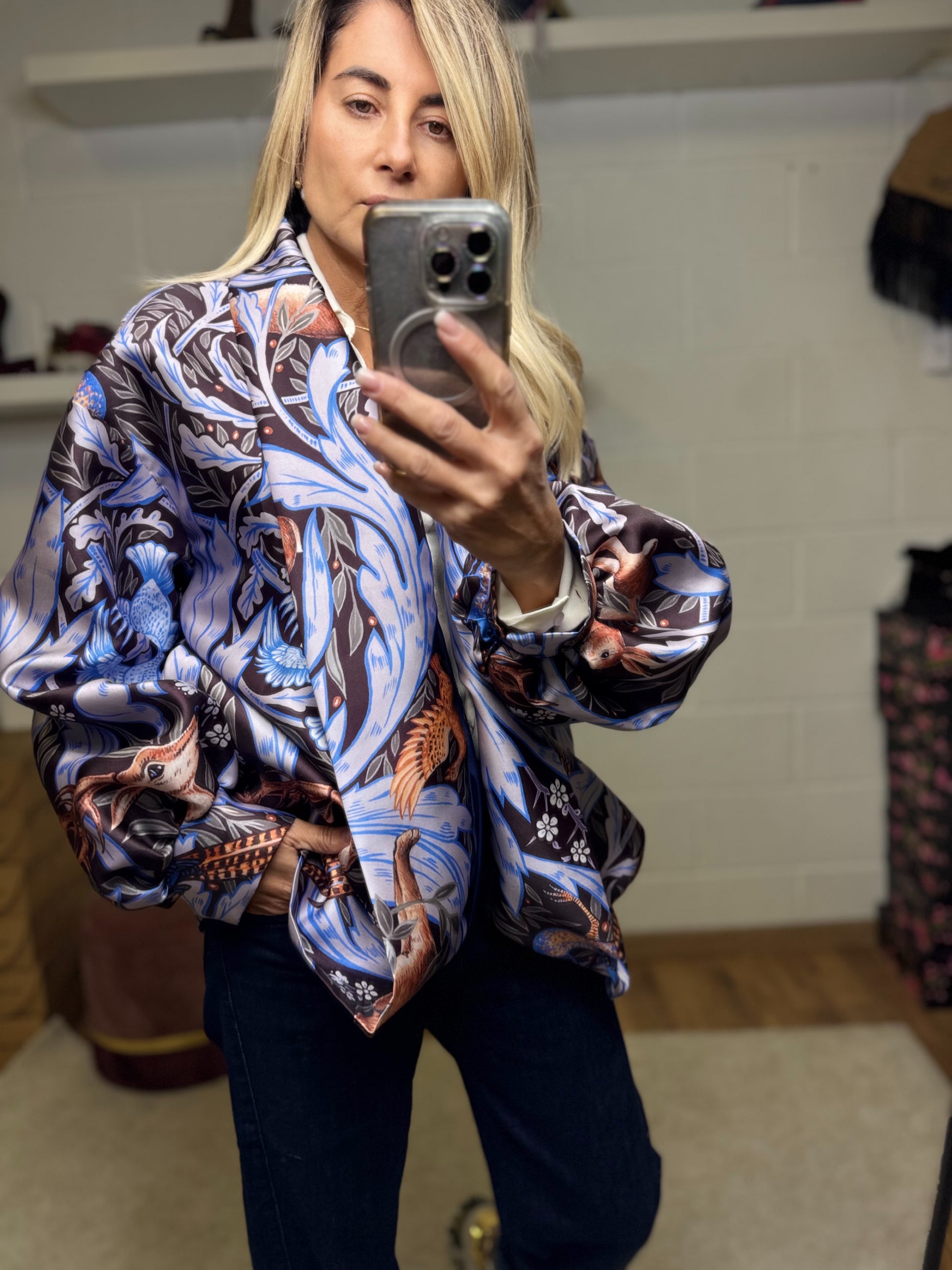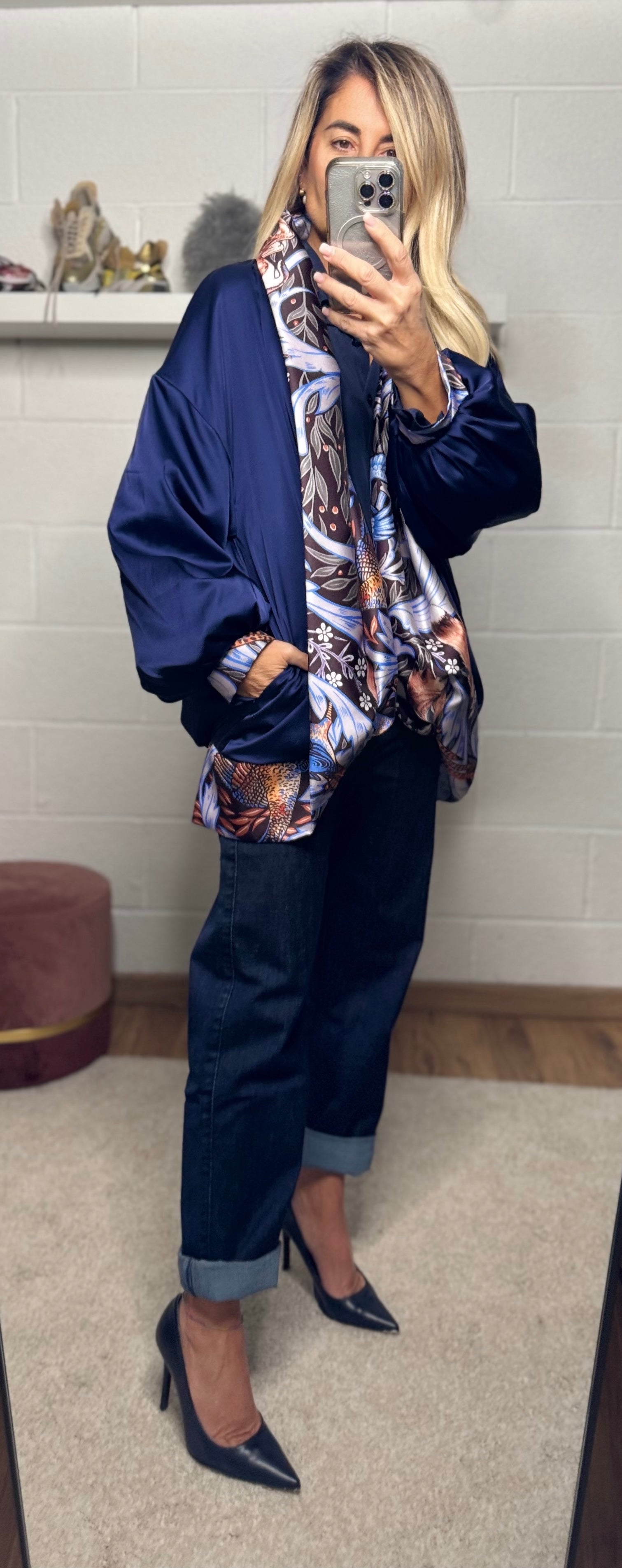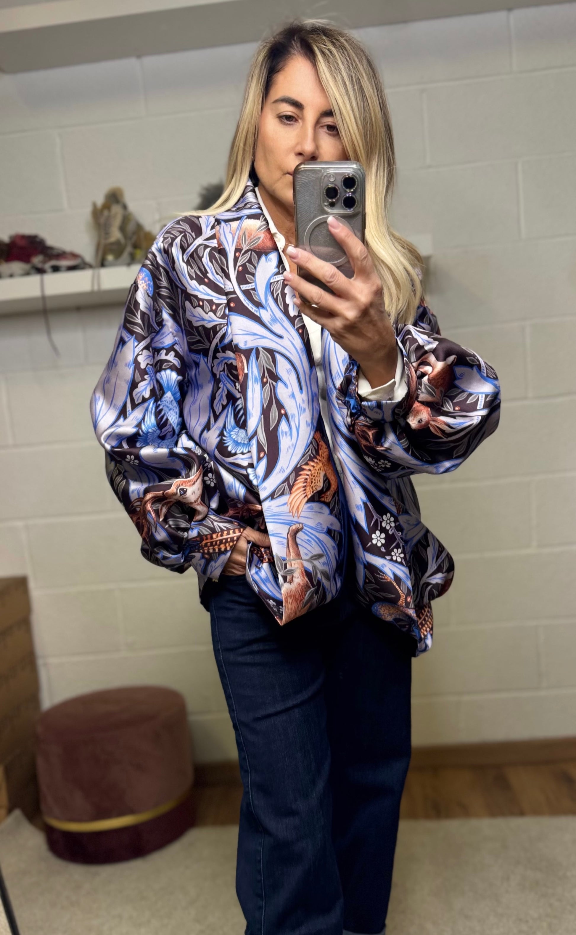 Un capospalla prezioso e ricercato, realizzato in mikado con una fantasia esclusiva e rifinito internamente in raso di seta. Ogni modello è un pezzo unico, creato in diverse combinazioni di colori e stampe: nessun bomber sarà mai uguale a un altro.