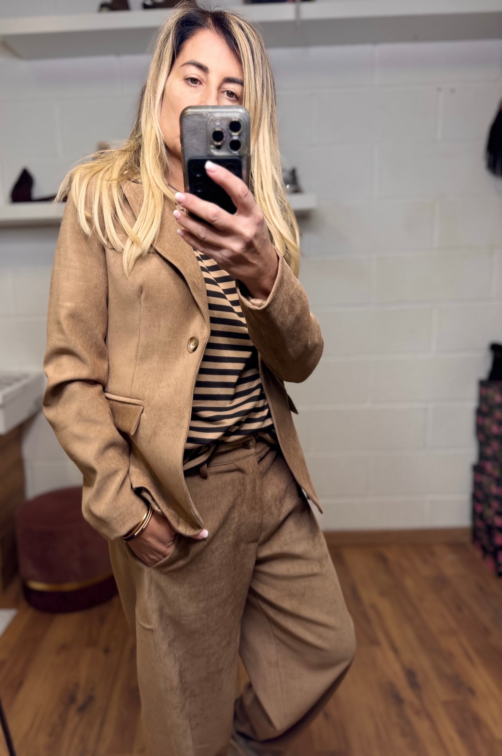 Aggiungi un tocco di eleganza rilassata al tuo guardaroba con il nostro Blazer Camel Luxe.