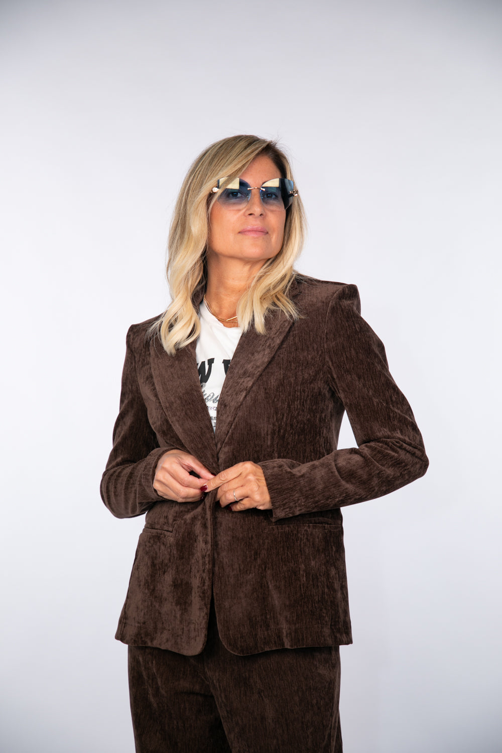 Realizzato in ciniglia vellutata color cioccolato, questo blazer monopetto unisce comfort e stile, con una texture morbida e luminosa che dona eleganza ad ogni look.