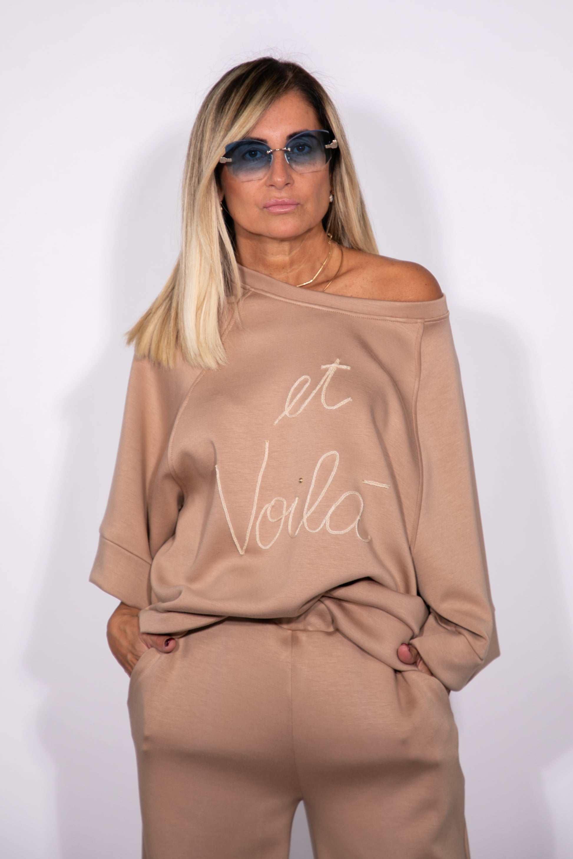 Un coordinato dal fascino essenziale e sofisticato. Realizzato in morbida felpa leggera, questo completo è composto da una maxi felpa con maniche ampie e scritta ricamata “et Voilà” sul davanti, abbinata a pantaloni dal taglio dritto e confortevole.