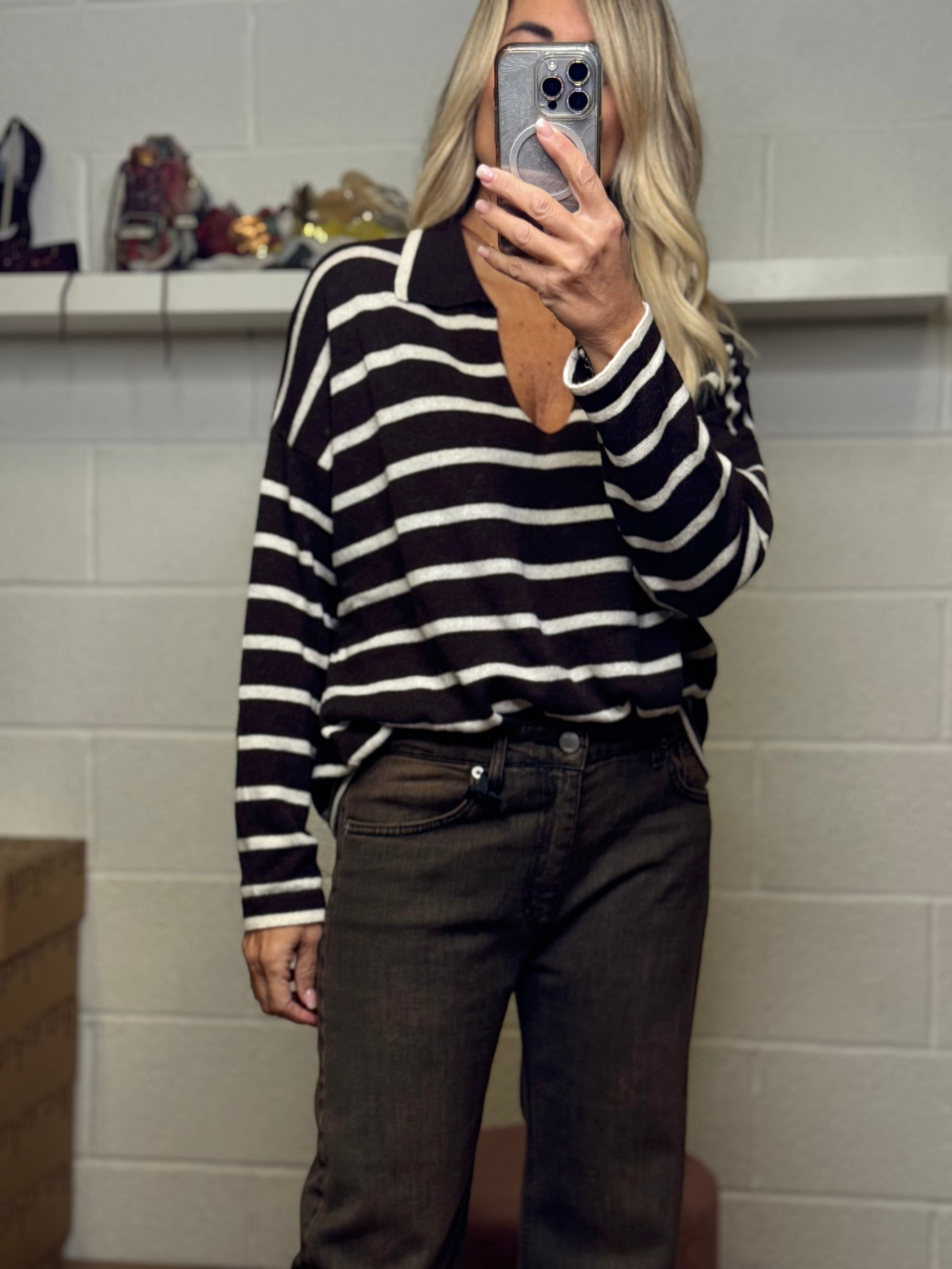 Un look effortless, femminile e super chic: la nostra maglia rigata morbida scivola delicatamente sulla spalla per un effetto sensuale ma sempre elegante, mentre il denim wide leg in tonalità cioccolato scolpisce la figura con una linea lunga e slanciata.