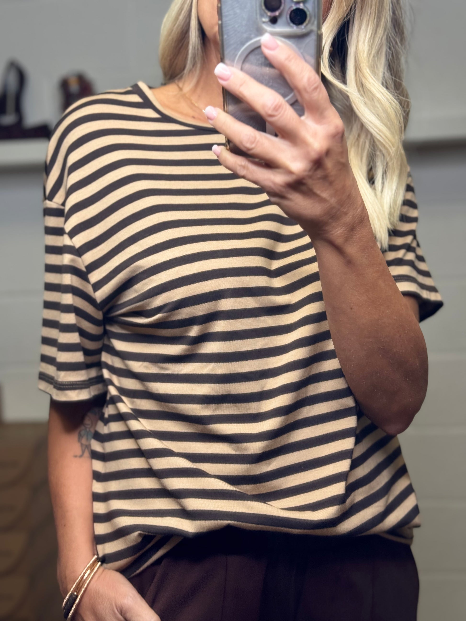 T-shirt a righe camel e cioccolato, dal taglio morbido e fluido.