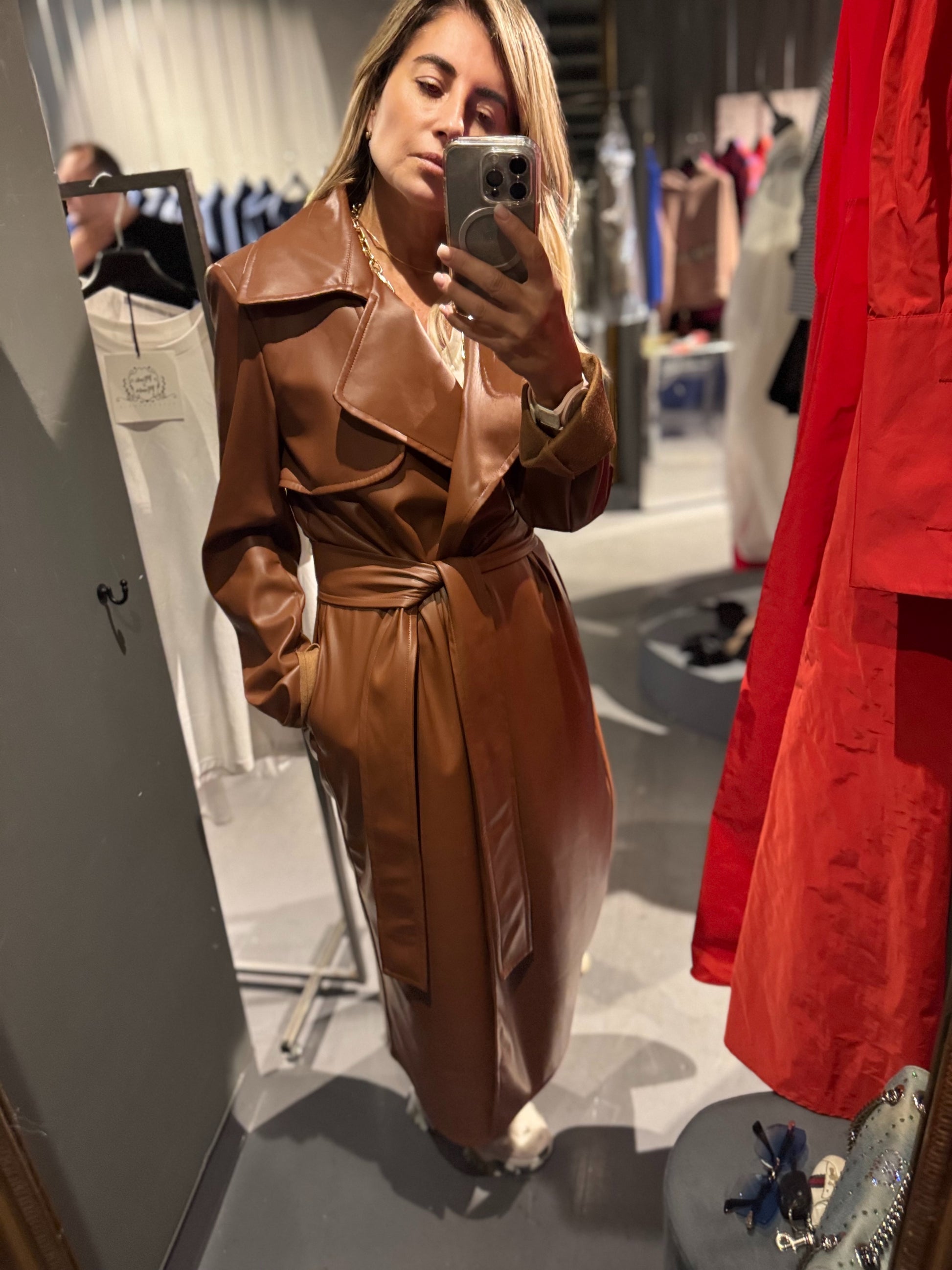 Trench lungo in eco-pelle color cognac con interno morbido effetto suede e cintura in vita che scolpisce la silhouette.