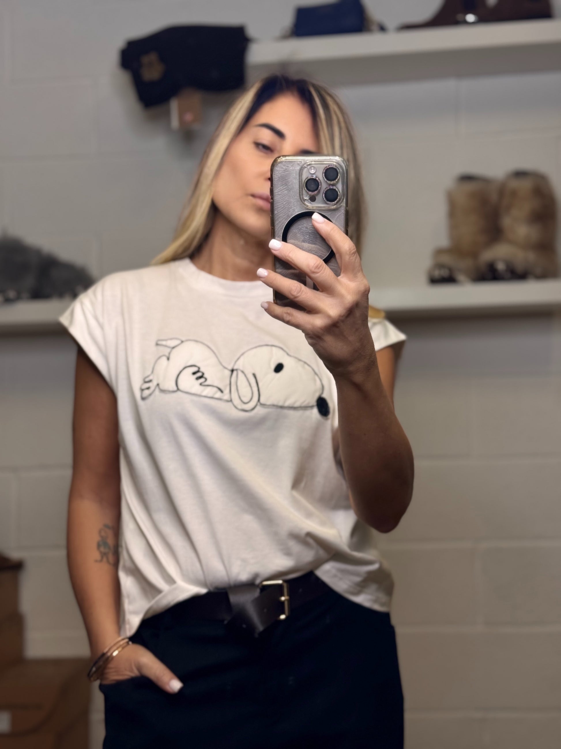 T-shirt donna dal taglio pulito e rilassato, impreziosita da una stampa Snoopy essenziale e iconica. Un capo facile, trasversale, pensato per essere indossato ogni giorno.