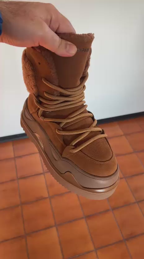 Multimateriale in tessuto e pelle. Fodera di pelo. Suola in gomma outdoor. Altezza suola 30. Plantare estraibile.