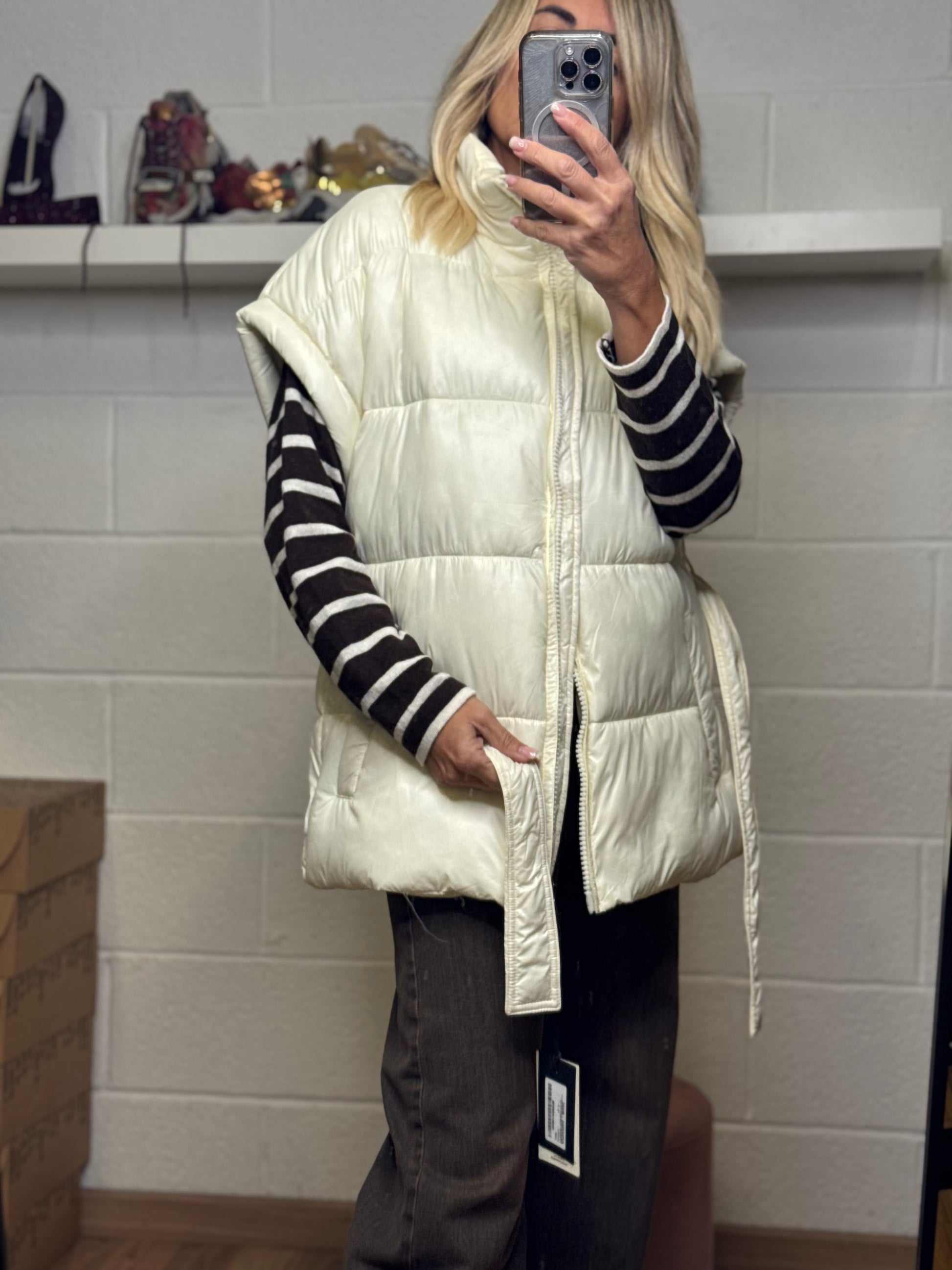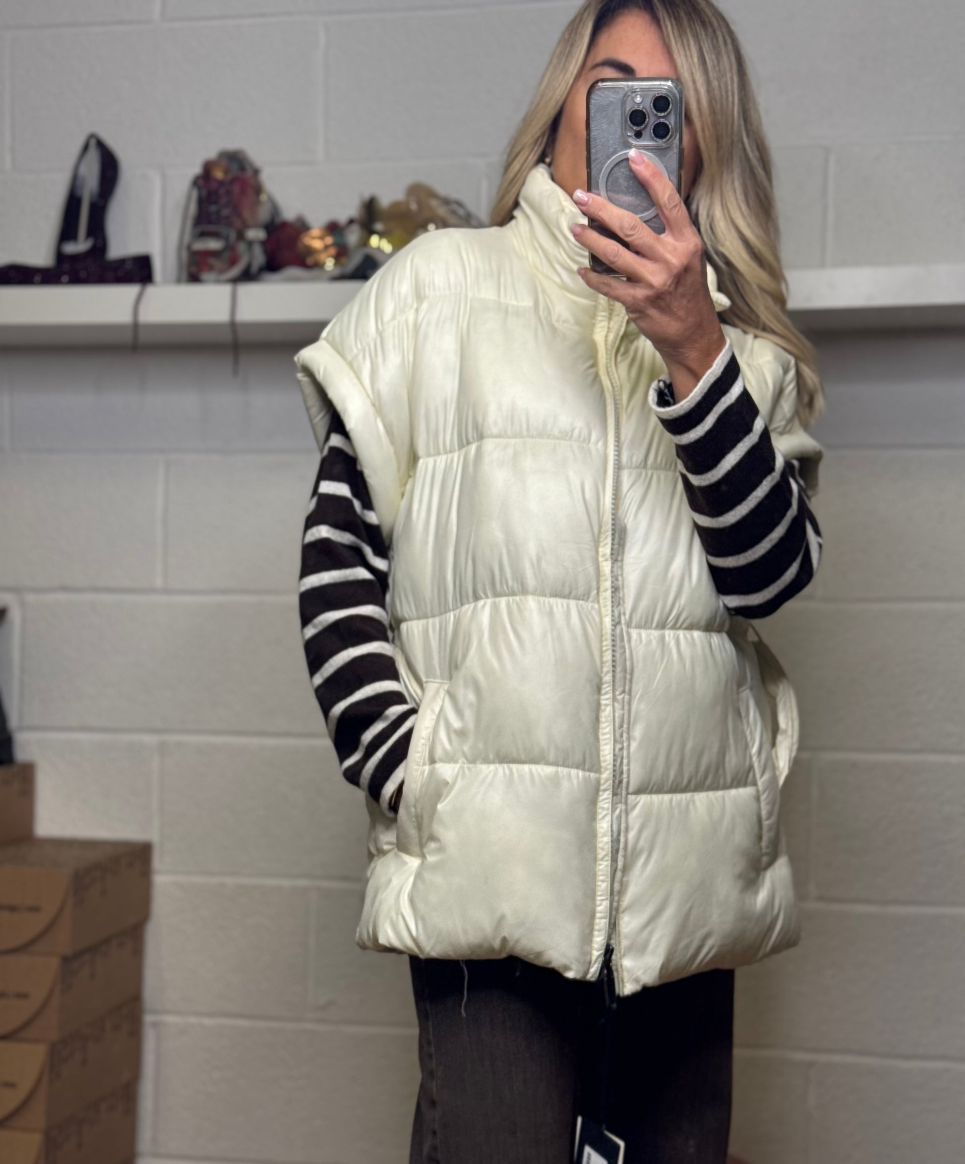 Gilet imbottito dal design moderno e versatile, realizzato in tessuto leggermente lucido color panna, perfetto per completare i look di stagione con stile e praticità.