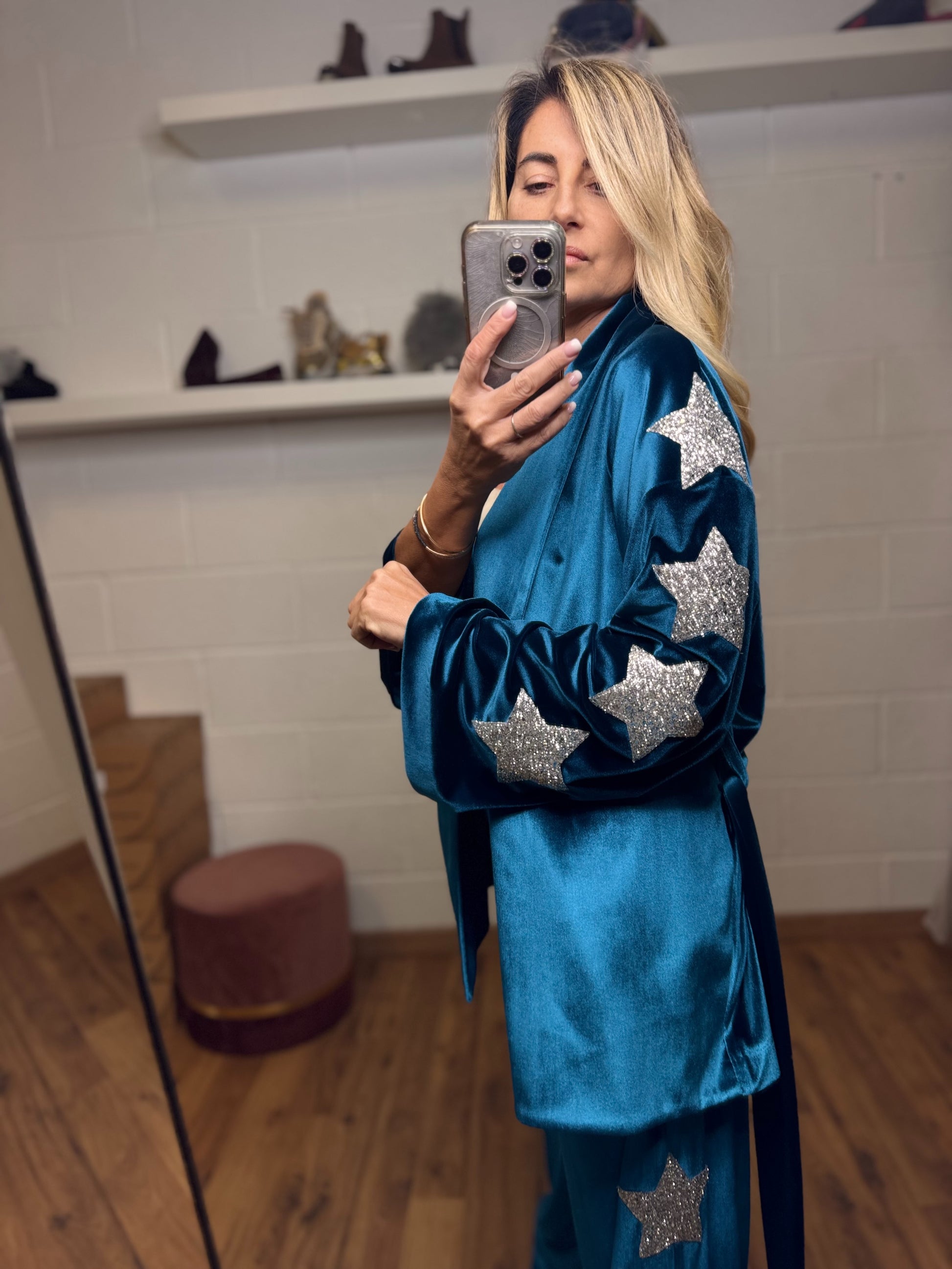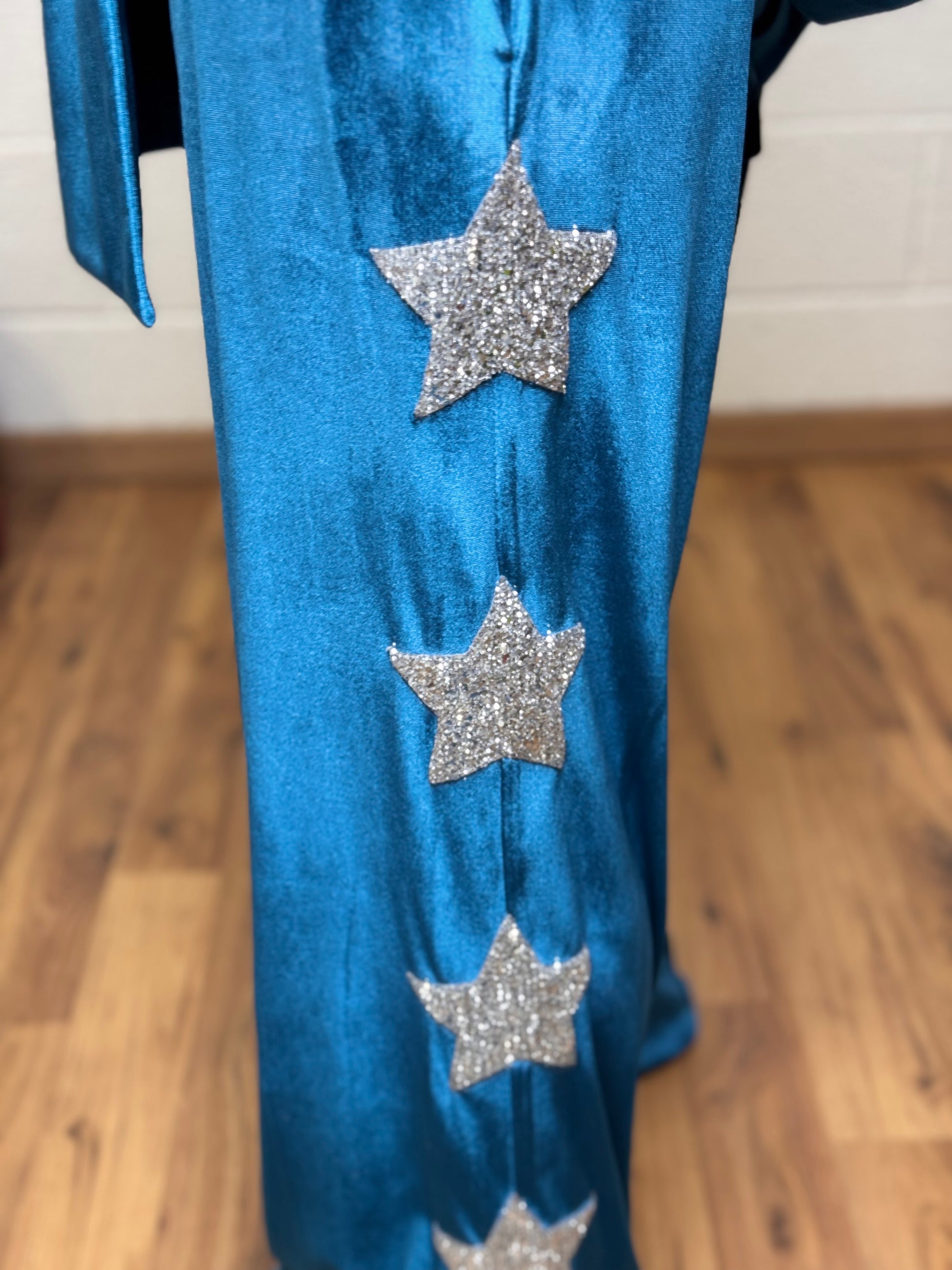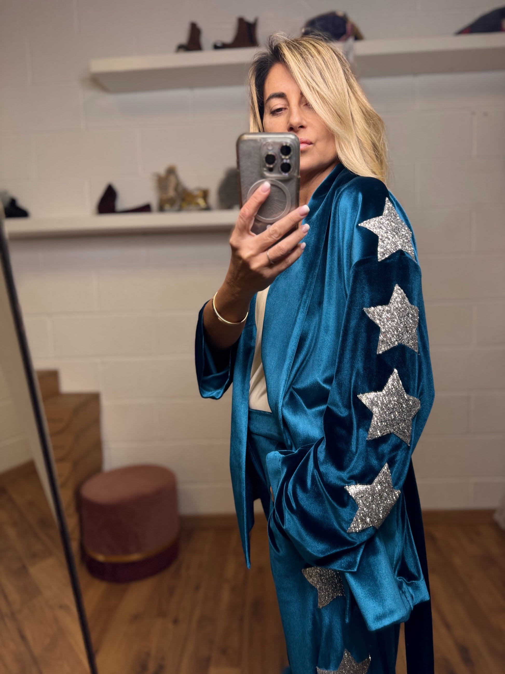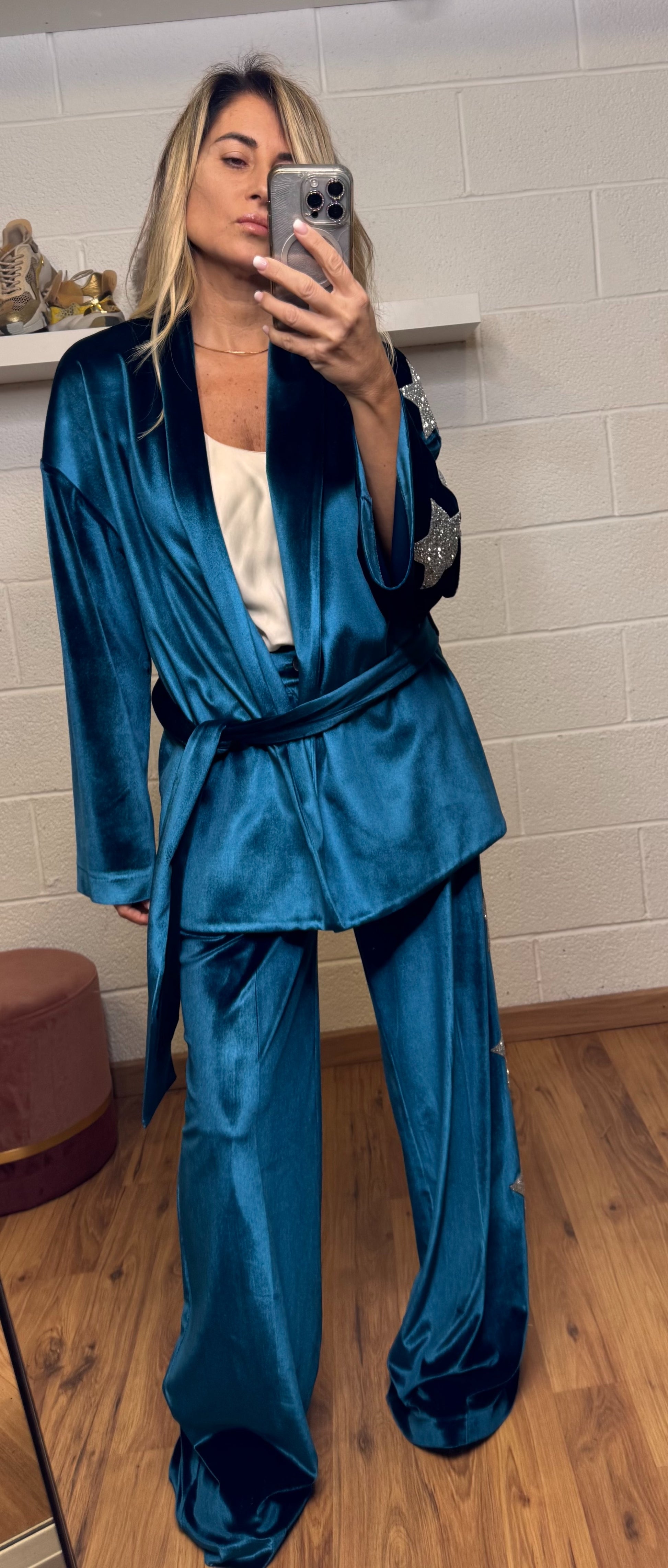 Completo due pezzi in velluto luminoso, composto da kimono morbido e pantalone palazzo impreziosito da applicazioni di stelle glitter lungo le maniche e i lati del pantalone.