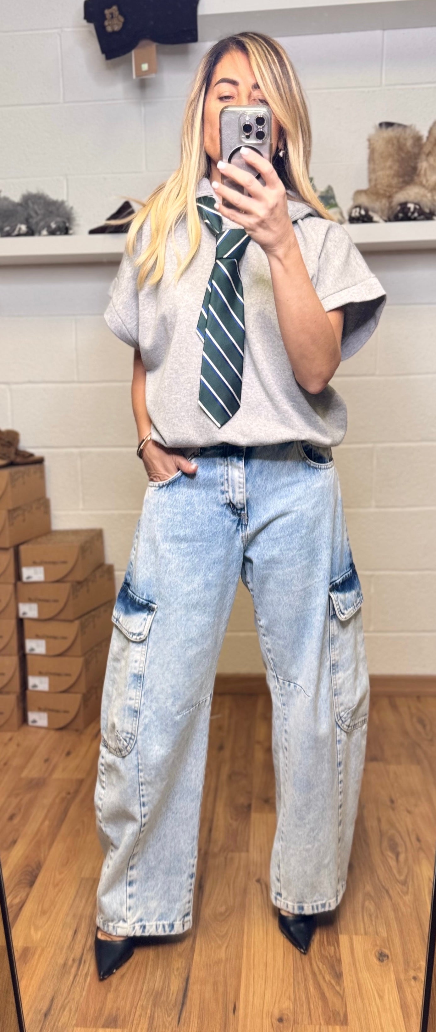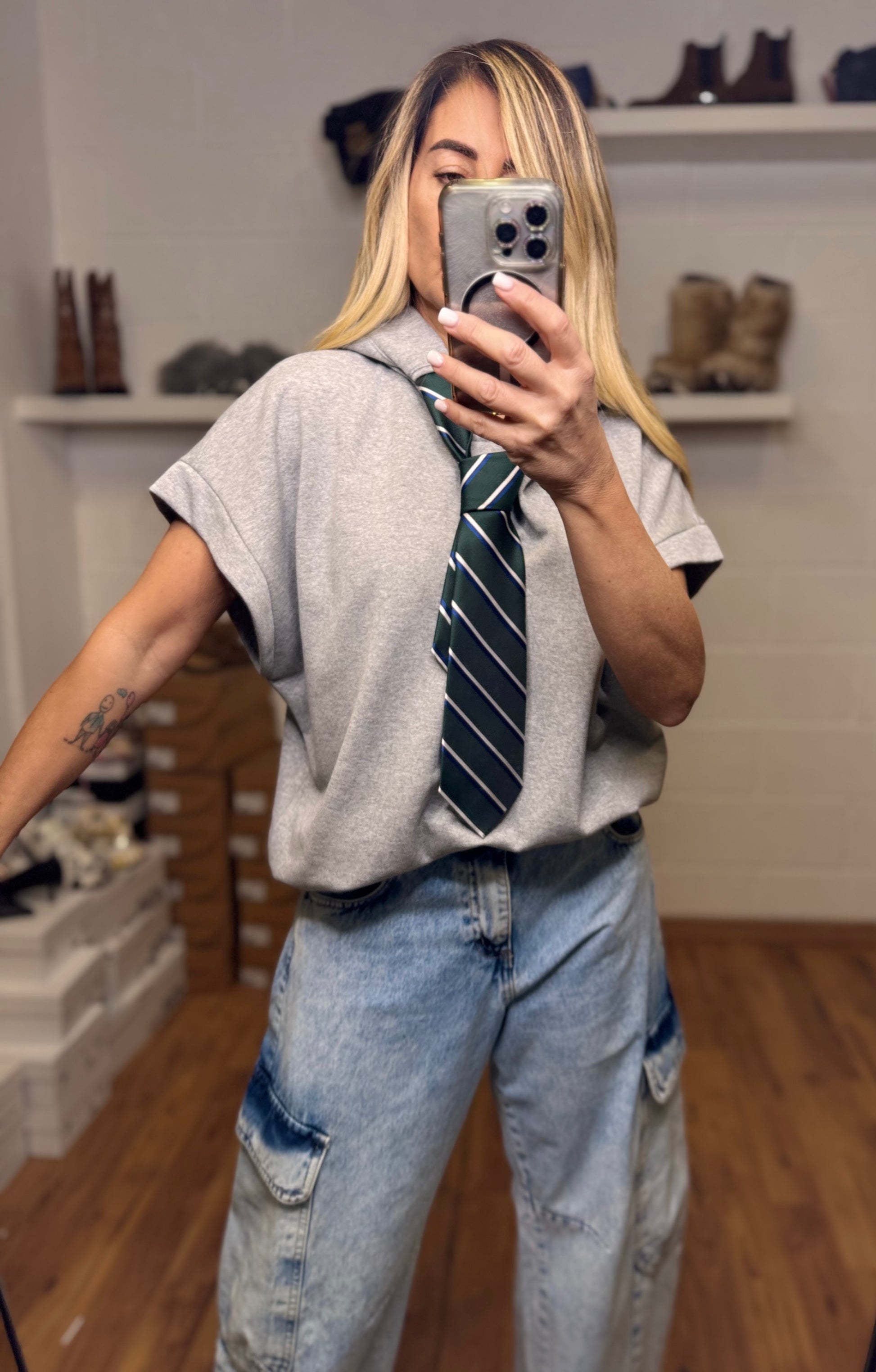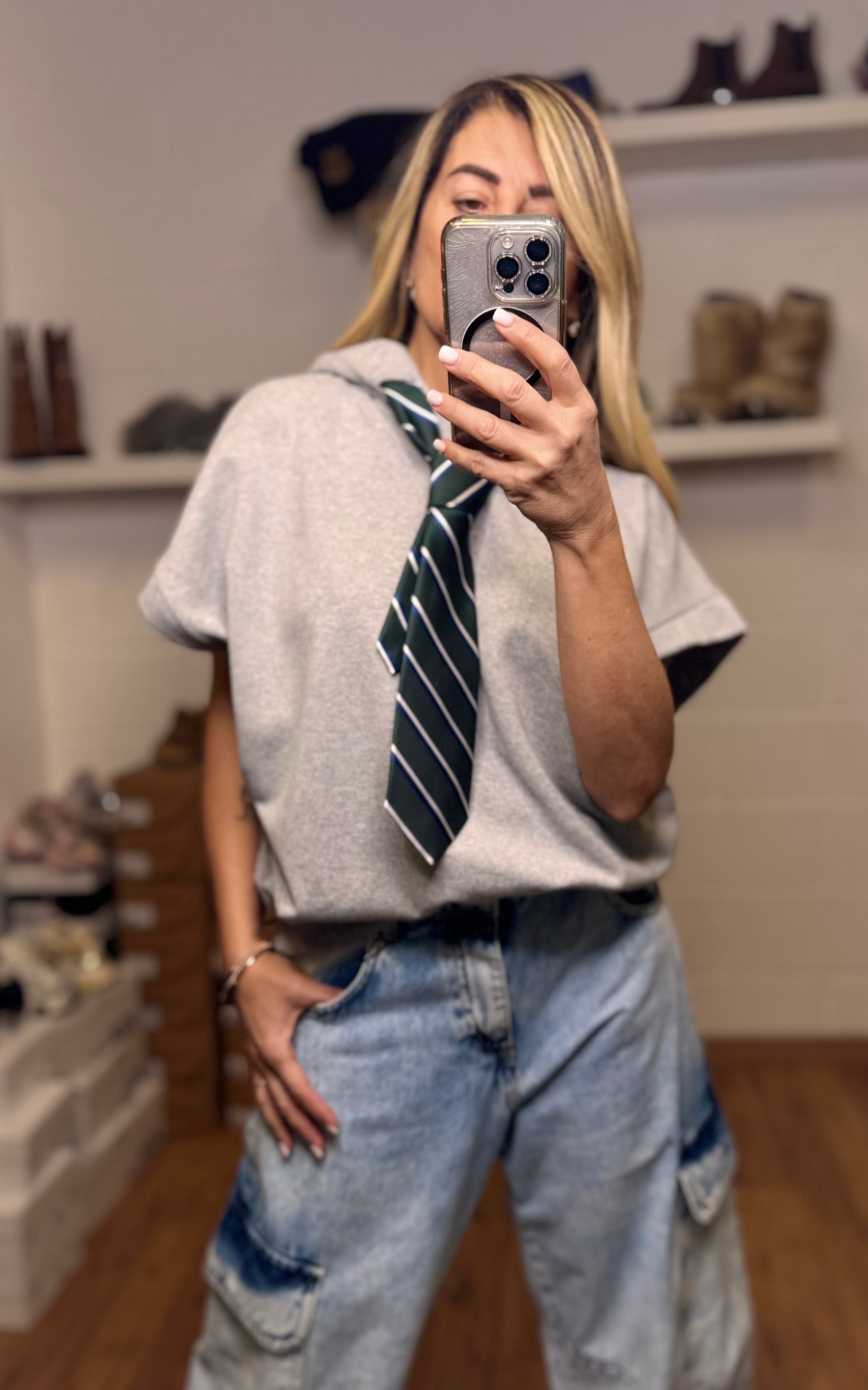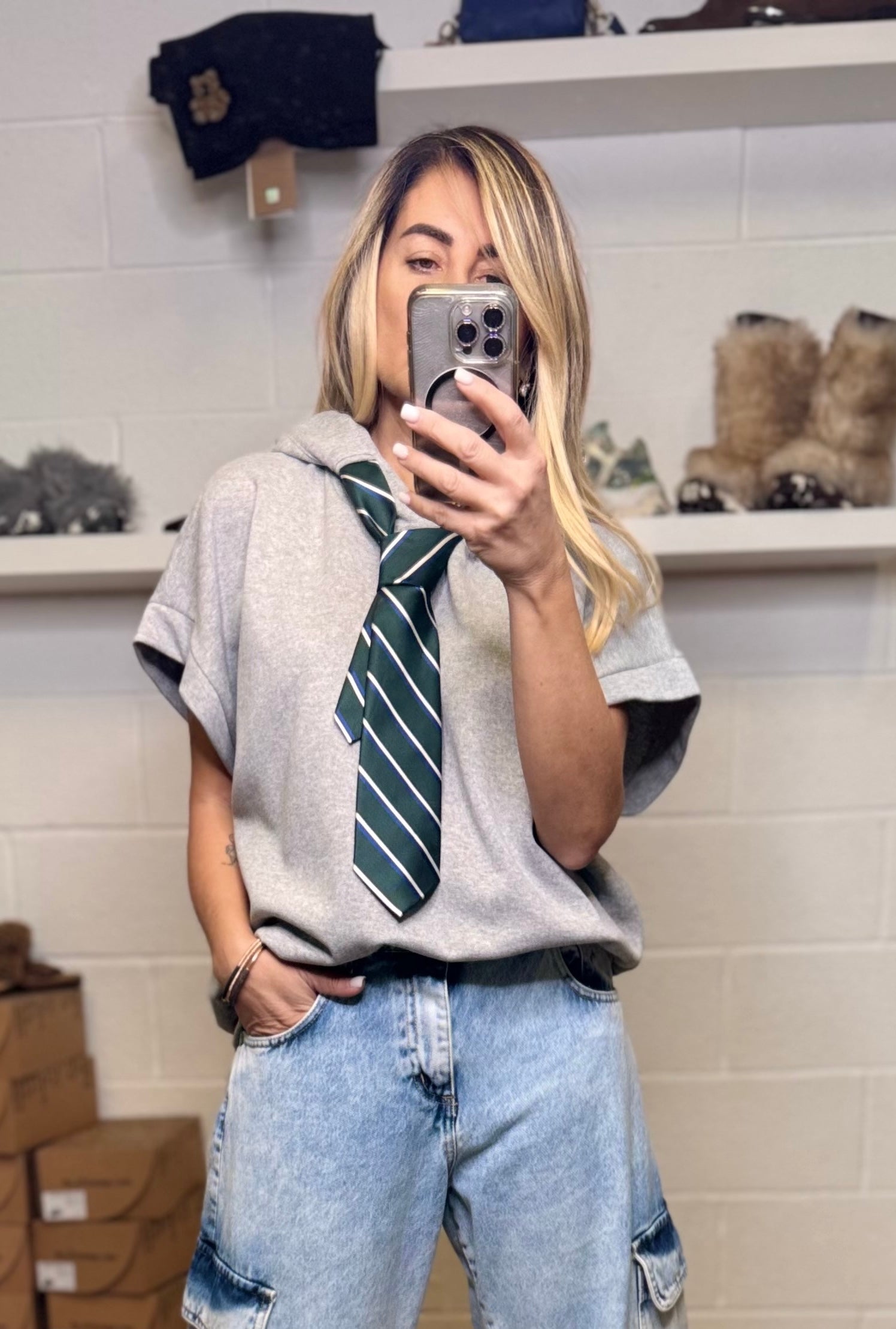 Il dettaglio distintivo è la cravatta decorativa a righe, che aggiunge un contrasto inaspettato e dona al capo un carattere moderno e fashion-forward. Le maniche corte con taglio ampio completano il design, rendendola perfetta per outfit casual ma curati nei dettagli.