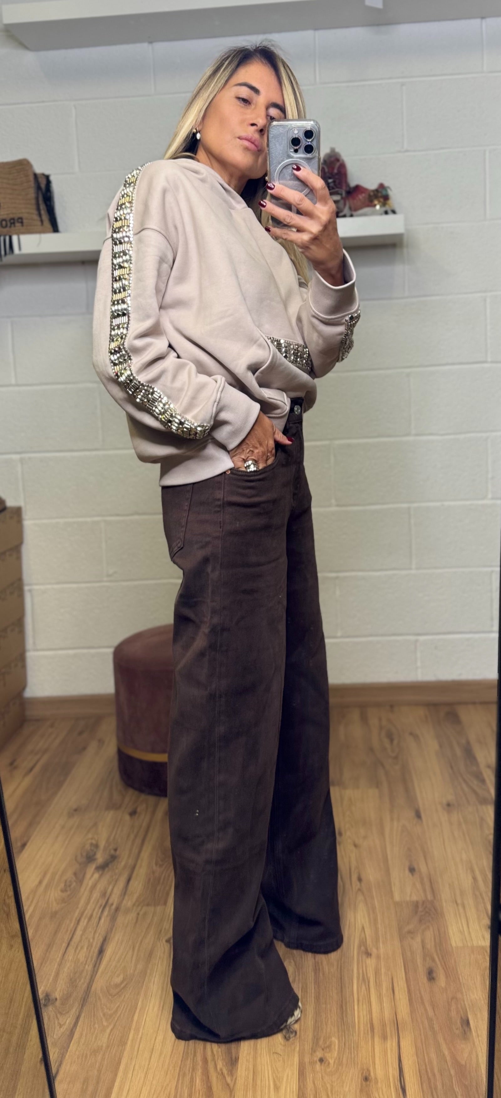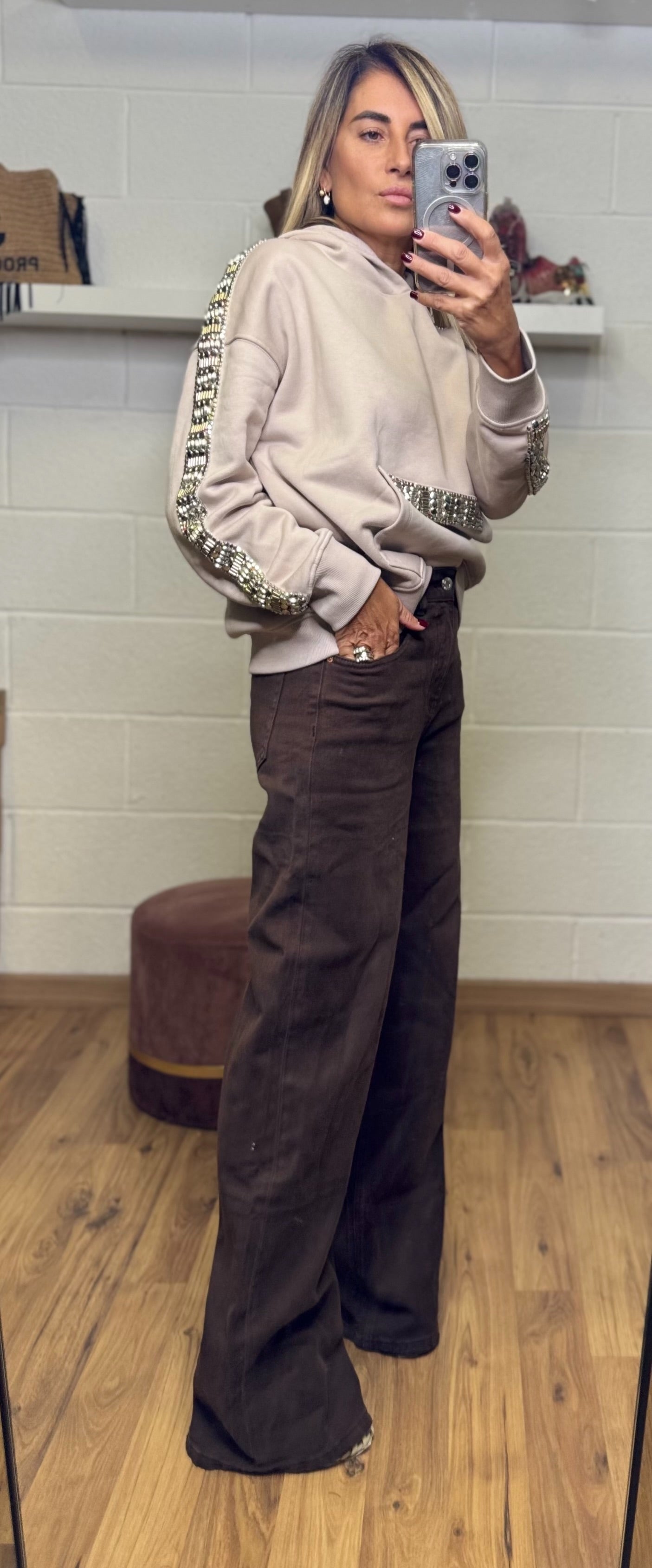 Vestibilità over, texture morbida e dettagli luminosi che rendono ogni capo un pezzo unico.