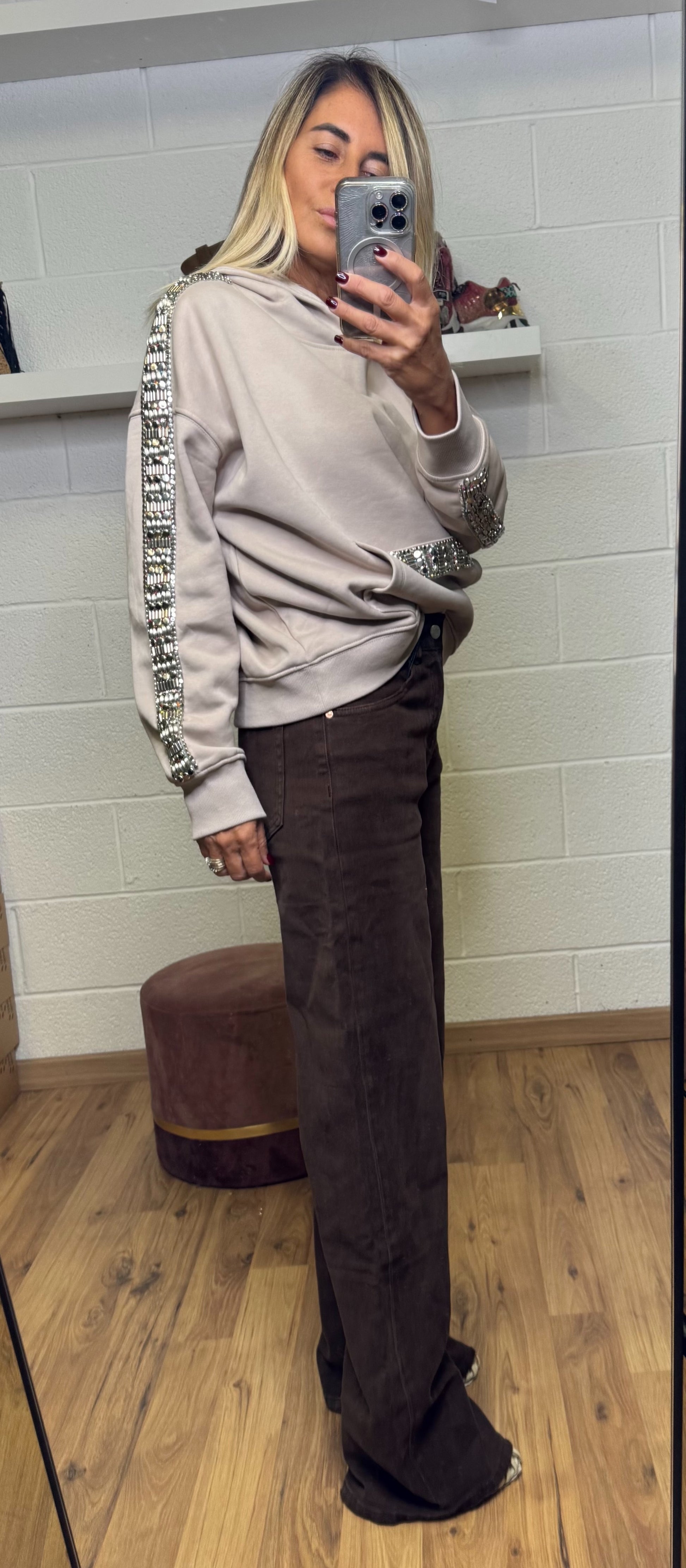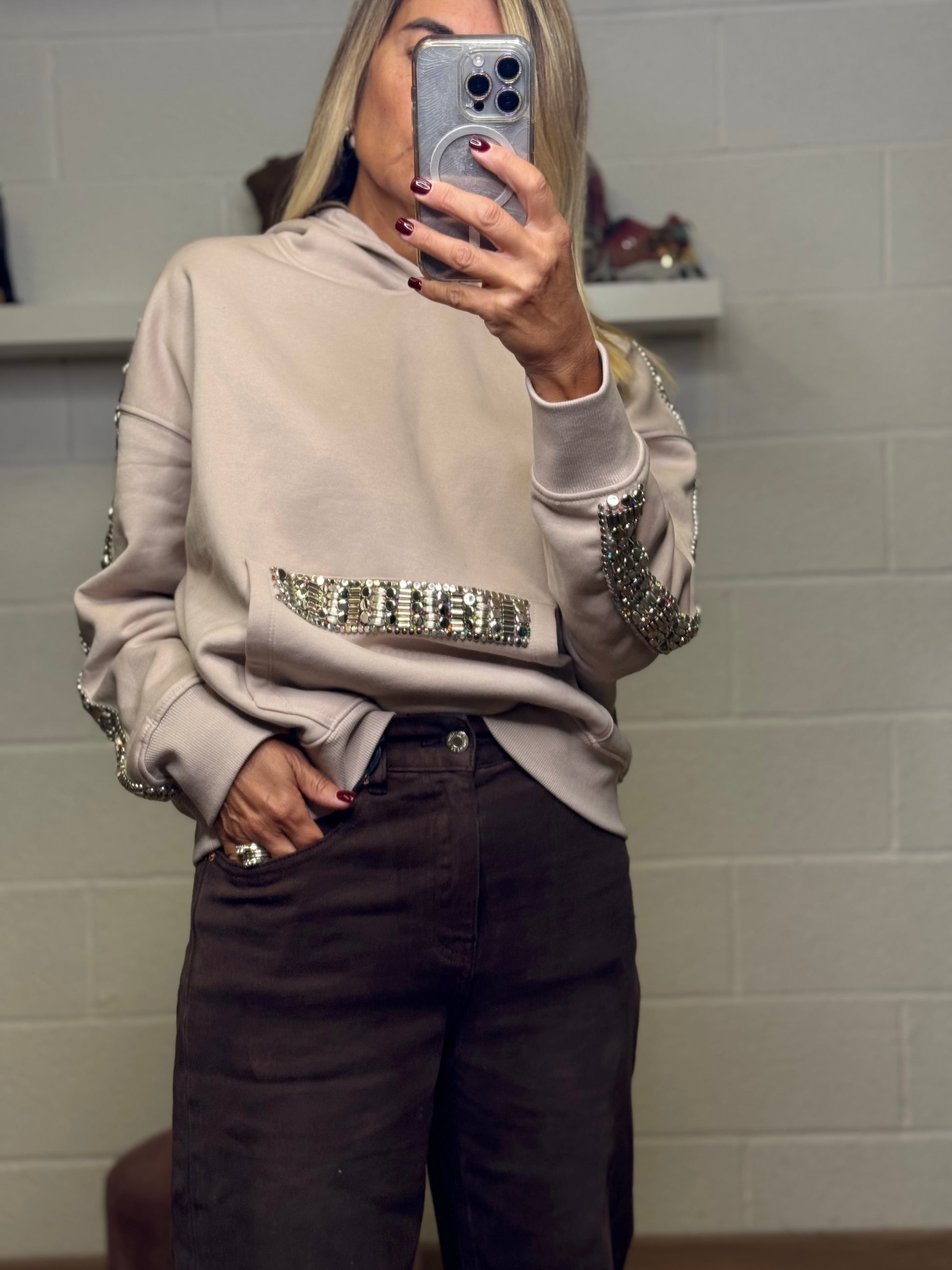 Felpa in morbido cotone color beige chiaro, impreziosita da applicazioni gioiello ricamate a mano lungo le maniche e sulla tasca frontale.